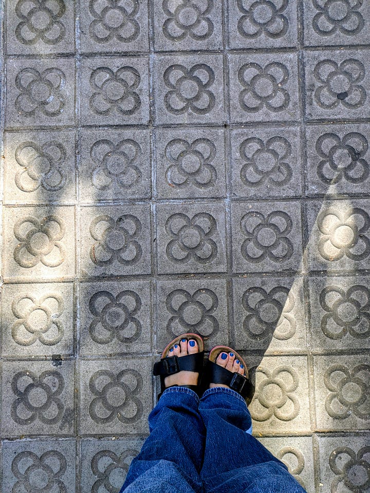 (clockwise) Barcelona architecture, Eva Fabrega at Bombon Gallery, Victoria at Mayoral, my toes and the iconic Barcelona sidewalk tiles