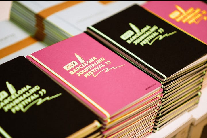 BJF '25 notebooks, founders Marusha and Oliver, our venue in a Barcelona art school, and my friend Jeanne trying to decide on her next workshop
