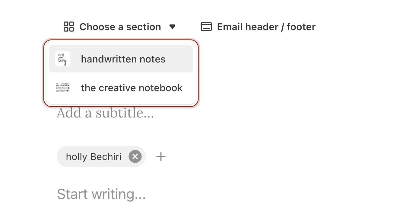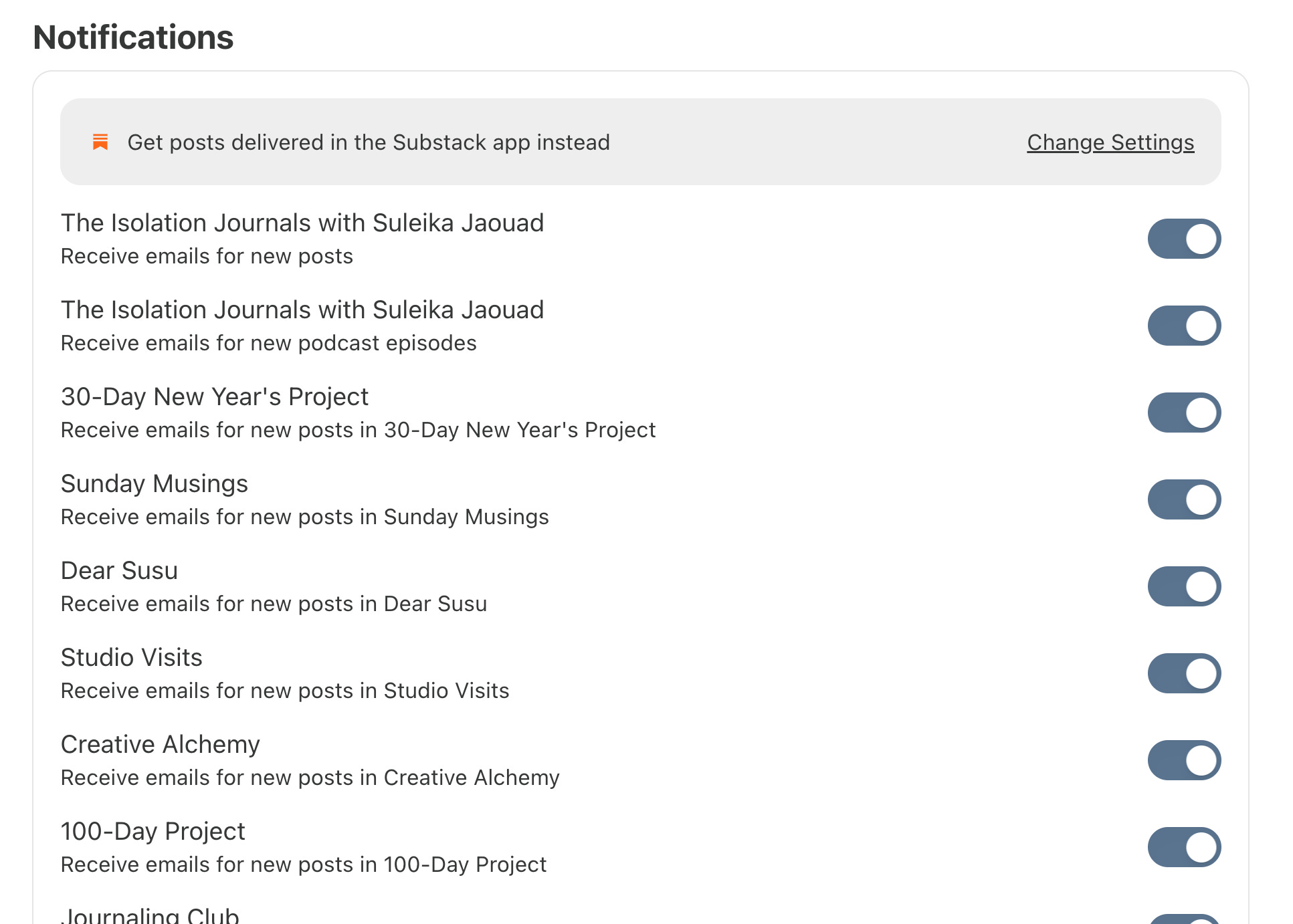 This will bring you to your settings specifically for that subscription. I selected Suleika Jaouad at The Isolation Journals with Suleika Jaouad because well, she’s amazing, and a guru at journaling to boot, but also because over the years since Isolation Journals started during the pandemic, she’s added multiple sections. Once there, scroll down just a bit to Notifications, and toggle on and off whatever you’d like to receive or not receive. That’s it!